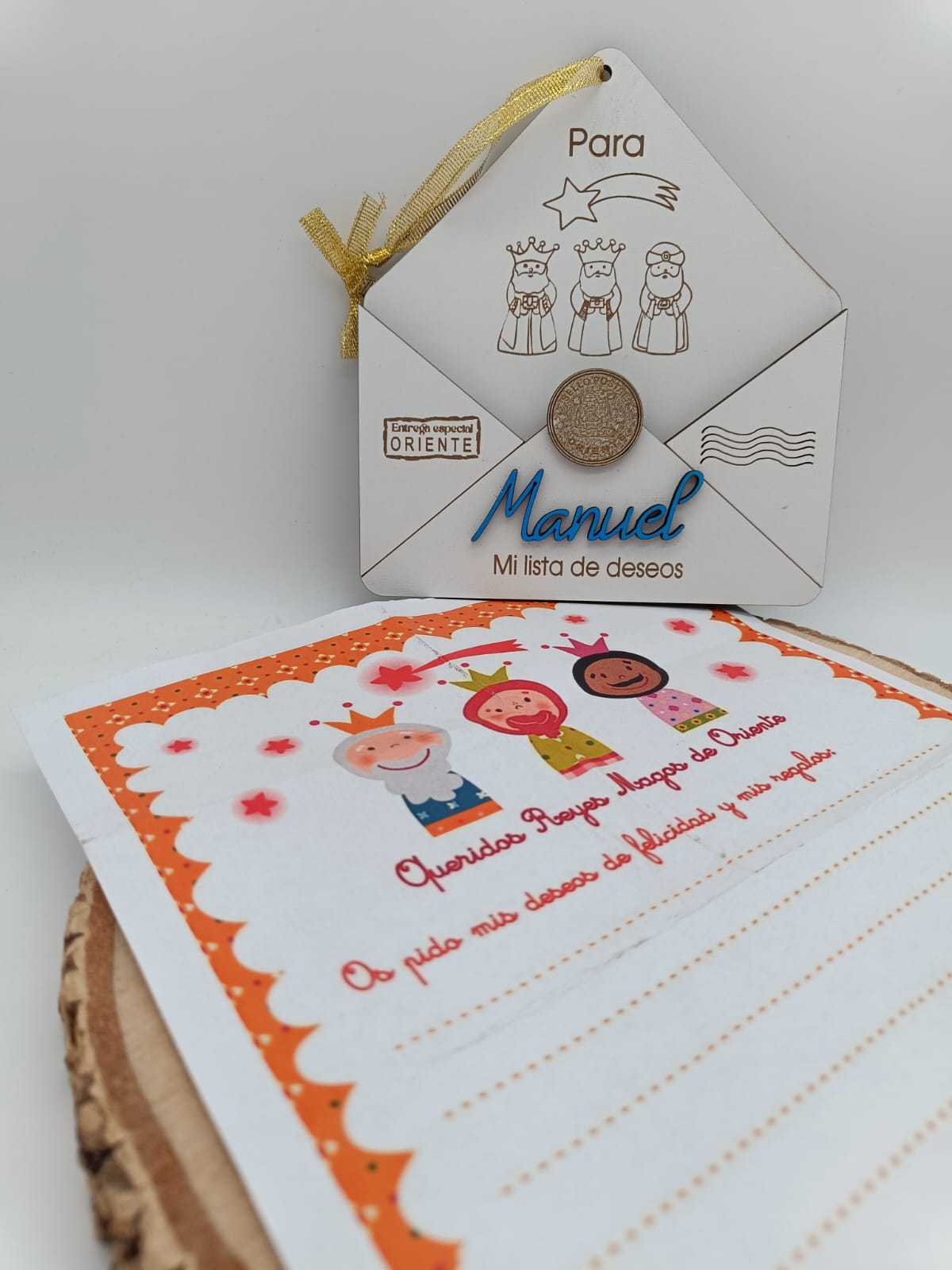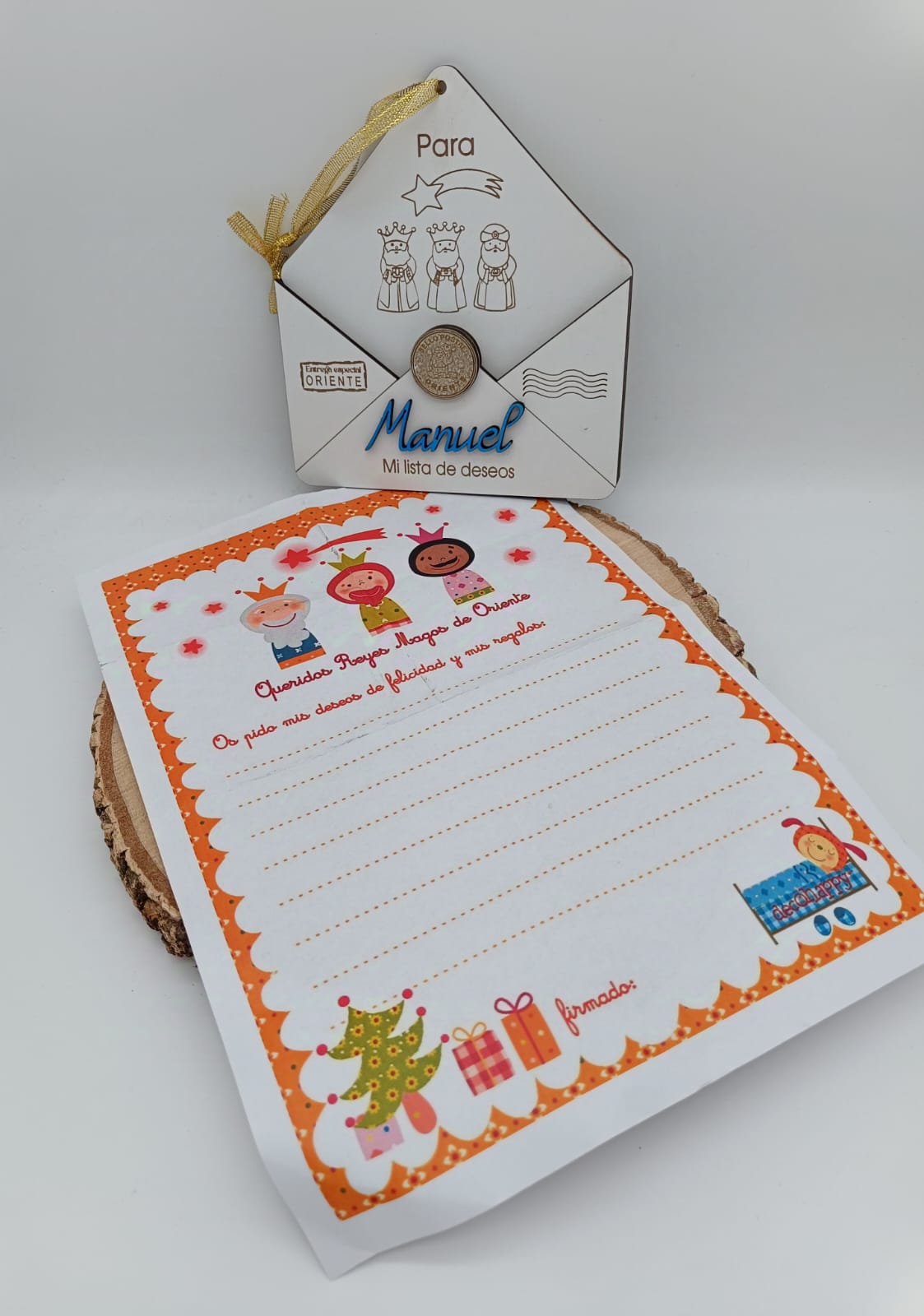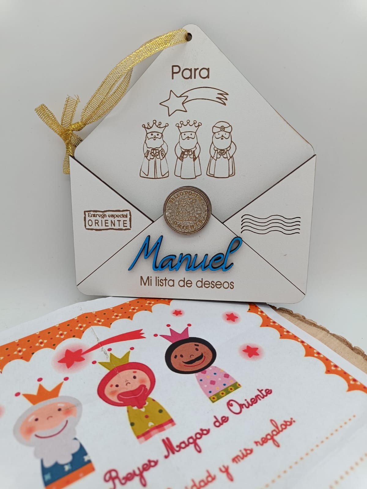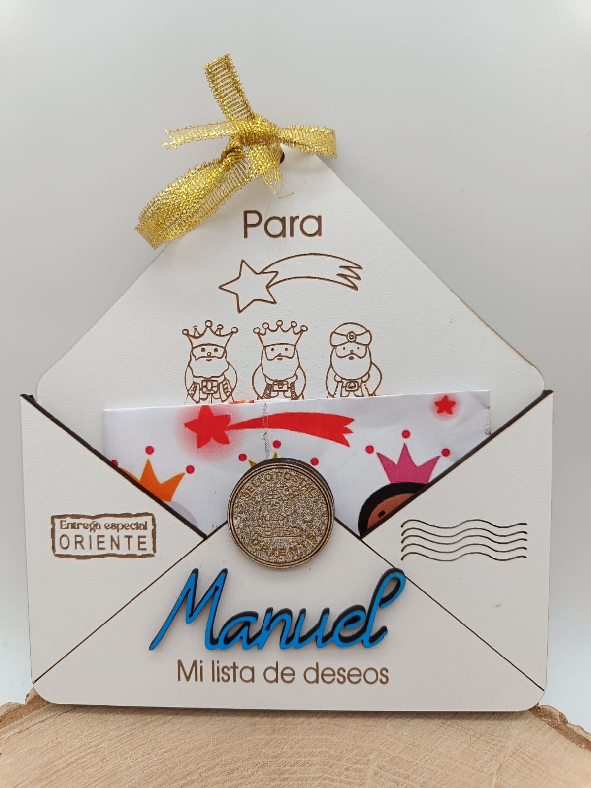 Sobre de madera para colgar en árbol de Navidad o en puerta de habitación, incluye nombre y carta en papel para escribir.