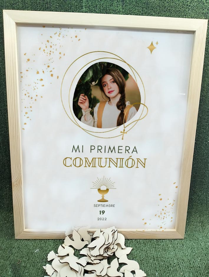 Cuadro firmas totalmente personalizado para ese día tan especial. Cuadro de 42×52 cm tipo hucha en el que podrás elegir la forma de la ficha de firma. si quieres una forma especial solo tienes que comunicarlo por whatsapp. la cantidad de fichas para este articulo es por defecto entre 50 y 60 unidades, paramas cantidad comunicar en pedido. Tienes la opción de poner el NOMBRE EN MADERA. SI POR CUALQUIER MOTIVO LO QUIERES PERSONALIZAR CON DIBUOS ANIMADOS EQUIPO DE FUTBOL O FONDO PERSONALIZADO SOLO TIENES QUE COMUNICÁRNOSLO Y NOSOTROS LO HACEMOS SIN COSTE ADICIONAL