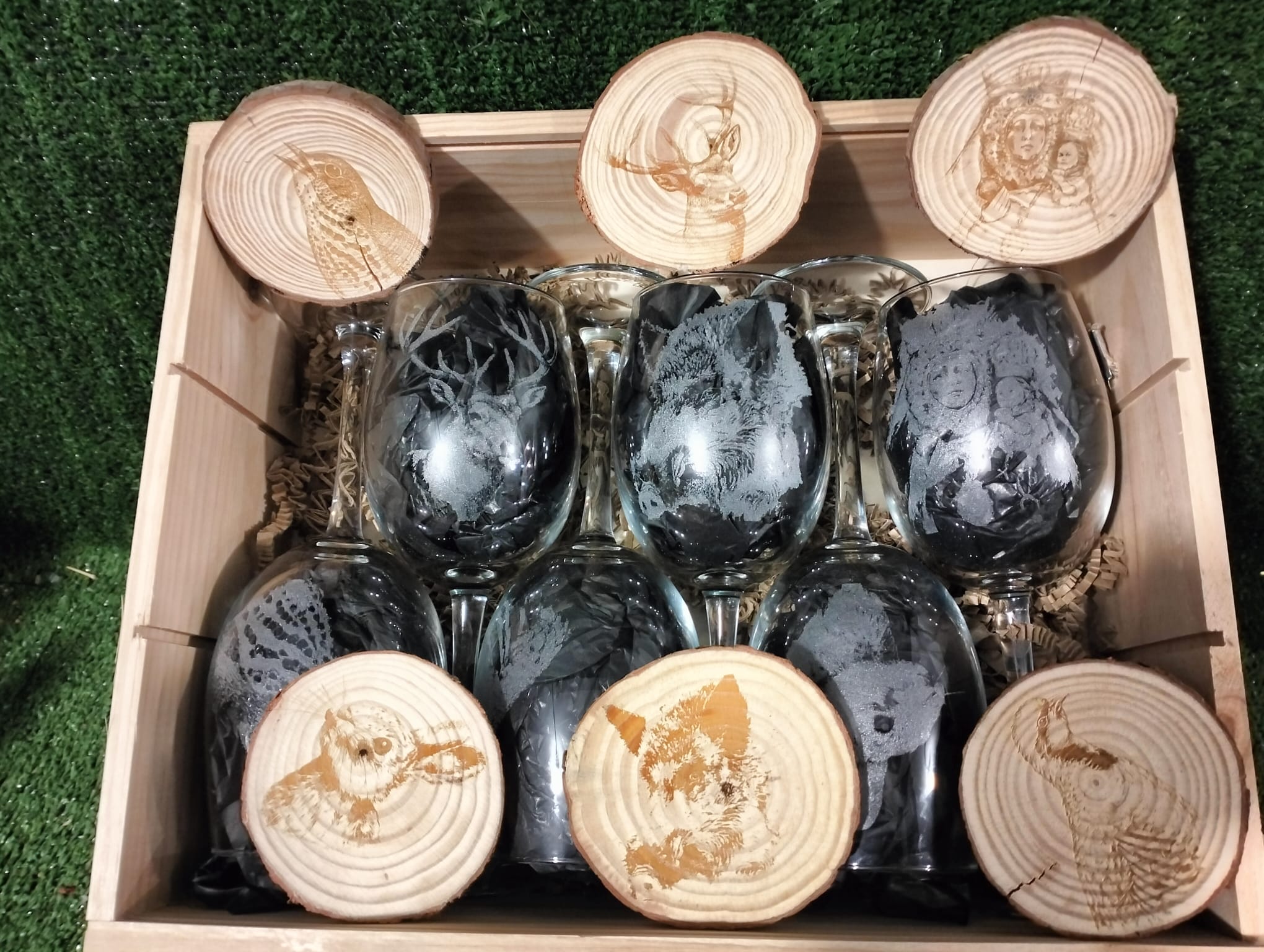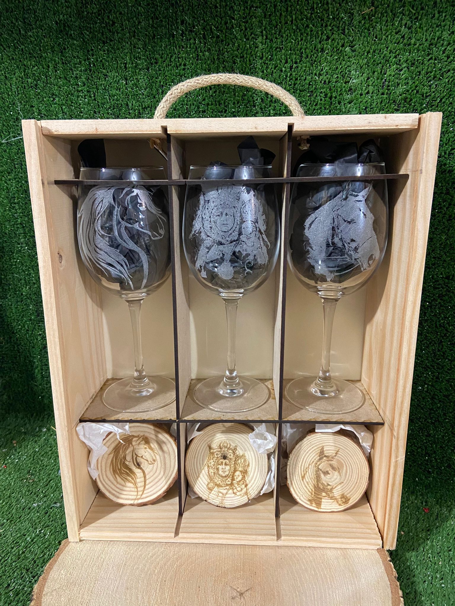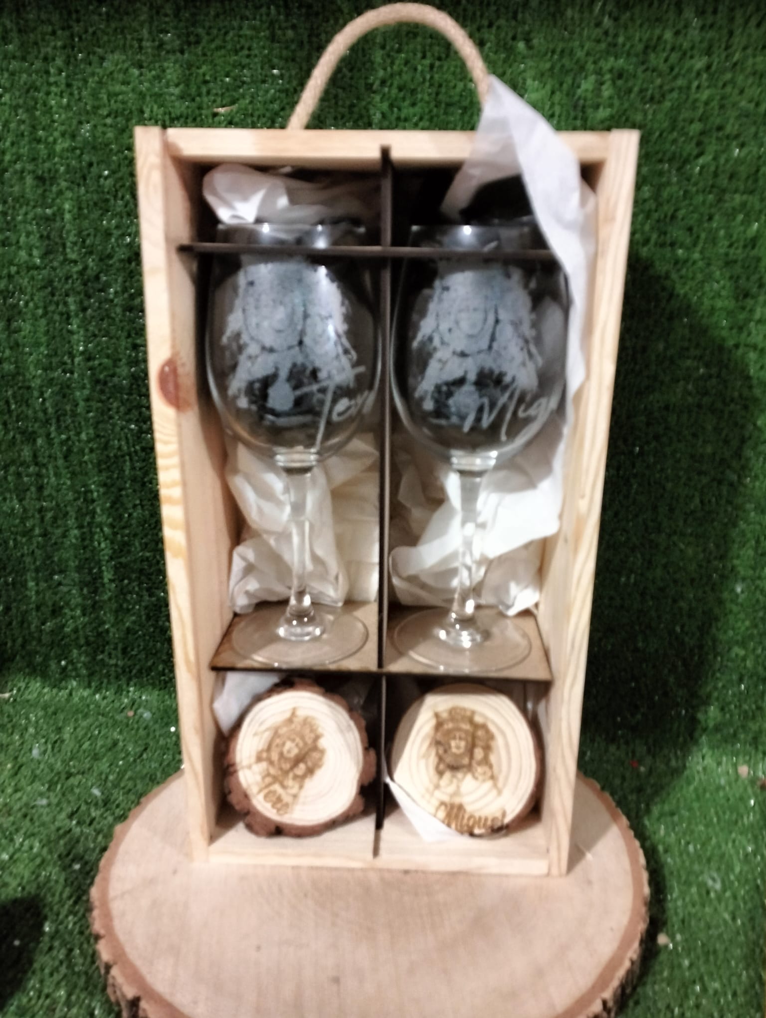 Caja para copas de vino de 20×35 x10 cm, acompañada de su copa grabada con el dibujo a elegir junto con posavasos de rodaja de madera con el mismo grabado que la Copa, puedes elegir entre 2 copas, 3 copas, 1 copa y botella vino, 2 copas y botella de vino y 6 copas si quieres poner nombre en caja o copa sólo tienes que escribirlo en la opción de Nombre, si la quieres sin nombre, ignora el campo, los grabado de las copas rogamos nos lo especifique lo mas claro posible en observaciones