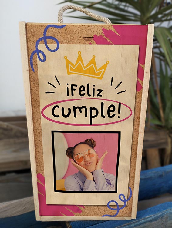 Caja de madera de 20x35cm impresa sobre madera sin perder el bonito efecto de la madera con la impresión, caja donde podrás optar por acompañar con copas de vino o cava POSAVASOS SIEMPRE INCLUIDOS EN EL PACK con el mismo nombre de la copa.