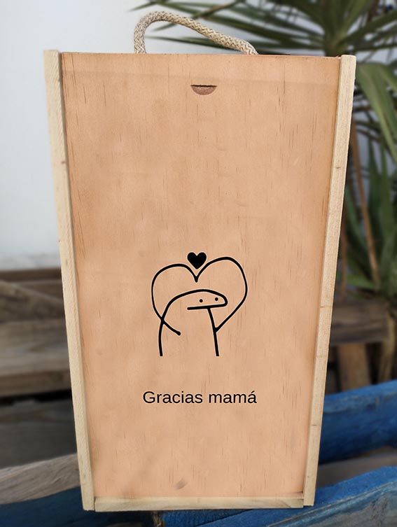 Caja de madera de 20x35cm impresa sobre madera sin perder el bonito efecto de la madera con la impresión, caja donde podrás optar por acompañar con copas de vino o cava POSAVASOS SIEMPRE INCLUIDOS EN EL PACK con el mismo nombre de la copa.