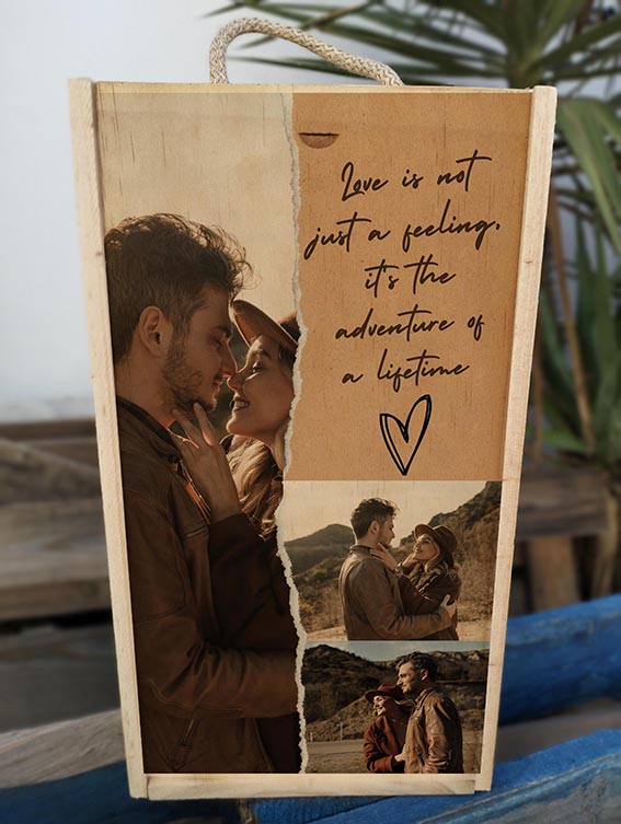 Caja de madera de 20x35cm impresa sobre madera sin perder el bonito efecto de la madera con la impresión, caja donde podrás optar por acompañar con copas de vino o cava POSAVASOS SIEMPRE INCLUIDOS EN EL PACK con el mismo nombre de la copa.