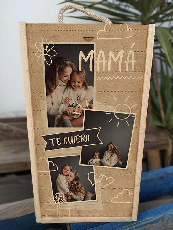 Caja de madera de 20x35cm impresa sobre madera sin perder el bonito efecto de la madera con la impresión, caja donde podrás optar por acompañar con copas de vino o cava POSAVASOS SIEMPRE INCLUIDOS EN EL PACK con el mismo nombre de la copa.